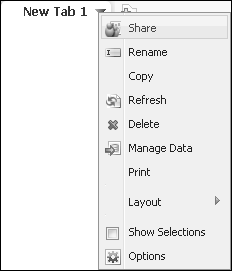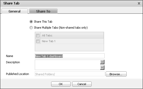 n Select which dashboards to include in the shared dashboard file. Select Share Multiple Tabs to choose additional dashboards to include in the dashboard file.Figure 5-2 Selecting one or more dashboards to share