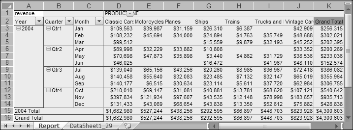 n Select Enable Pivot table, when you export a cross tab to Excel. When selected, this option enables Excel to display cross-tab data as a pivot table providing the user with the ability to further analyze the data. Figure 4-9 shows a cross tab exported to Excel.Figure 4-8 Exporting a chart to ExcelFigure 4-9 Excel displaying an exported cross tabThis feature is useful when you need to share the cross tab with users using applications other than Interactive Viewer. More information about cross tabs is available in later sections of this document.