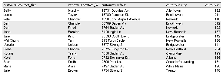 4 Choose Report→Build and Run. If Requester appears, make your selections and choose OK. e.Report Designer Professional generates the data object executable file, runs it, and displays the data rows in Report Viewer. Figure 4-14 shows the columns, reordered as specified in Data Row Editor.Figure 4-14 Report Viewer, showing the reordered columns