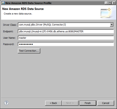 3 In New Amazon RDS Data Source Profile, specify the properties to connect to the MySQL or Oracle database instance on Amazon RDS.Figure 9-1 shows an example of properties to connect to a MySQL database instance in Amazon RDS.