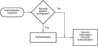 The Information Console security adapter enables other applications to authenticate users and log in to the Information Console application, for example, by using a URL. A custom security adapter can define alternate authentication requirements. In this way, an Information Console security adapter establishes an additional layer of logic to the existing Information Console authentication, as shown in
