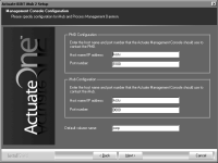 Figure 5‑23, type the cluster node name or IP address for the node. Type a port number or accept the default port number, 8100. The Actuate BIRT iHub service on Windows binds to this port number to listen for requests. Choose Next.