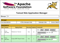 On the Tomcat main page, choose Manager App. In the manager login window, type the user name and password of the manager account defined in the tomcat‑users.xml file. When the BIRT report viewer application is running, the Running status for Eclipse BIRT Report Viewer is true, as shown in Figure 5‑2.