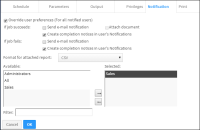 In this task you specify notification options if the scheduled job succeeds or fails. You also specify options to share the notifications with users or user groups.