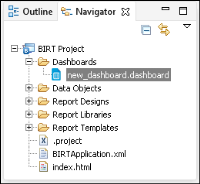 You can open a dashboard file in a BIRT project or BIRT application using the Navigator. Navigate to the folder containing the file and double-click the dashboard file, as shown in