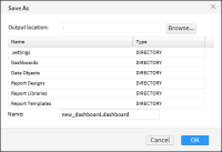 Save changes to a dashboard by choosing File—Save. To save the dashboard with a new name, choose File—Save as, navigate to a new location and give a new name for the dashboard file, as shown in