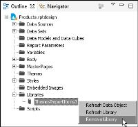 If a report already includes the default themes, in the Outline view, expand Libraries, then right-click ThemesReportItems3 and choose Remove Library, as shown in